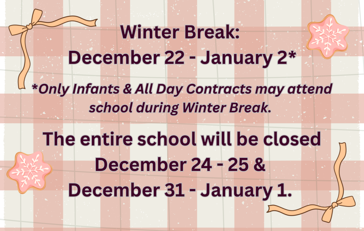 WINTER BREAK Only Infants & All Day Contracts may attend school during Winter Break. The entire school will closed December 24 - 25, and December 31 - January 1. The normal school schedule resumes on Monday, January 5, 2026. Print