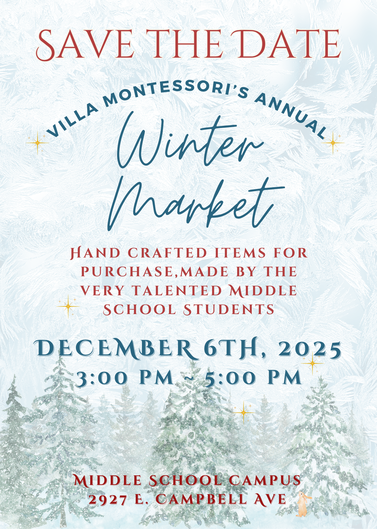 MIDDLE SCHOOL WINTER MARKET Come see all the magic happening at our Middle School! Handcrafted items made by our talented middle school students will be for sale at this annual winter market, from 3:00 - 5:00 pm at the Middle School campus. Print